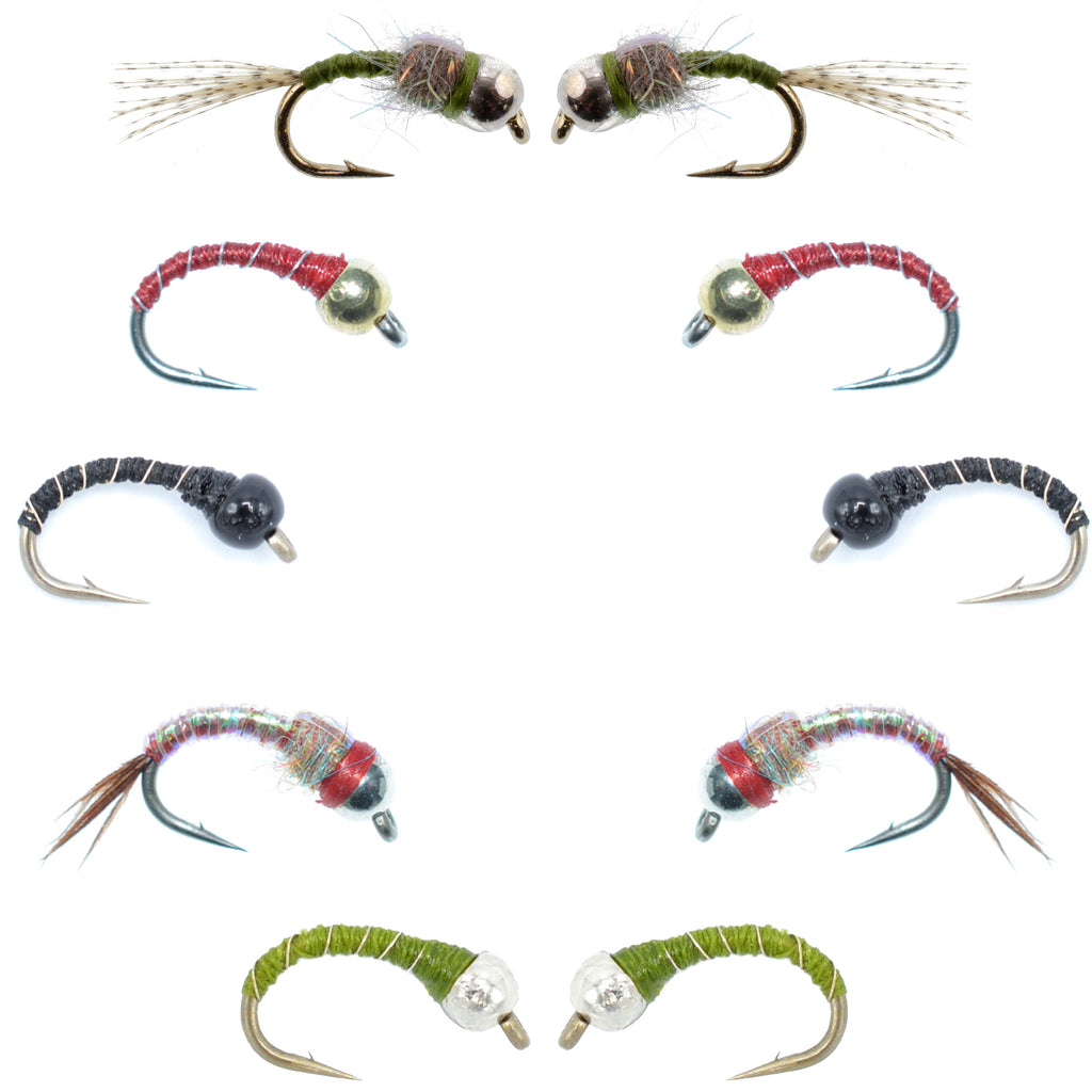 Surtido de 10 moscas húmedas atadas a mano con cabeza de cuentas, tamaños de anzuelo 14, 16, 18