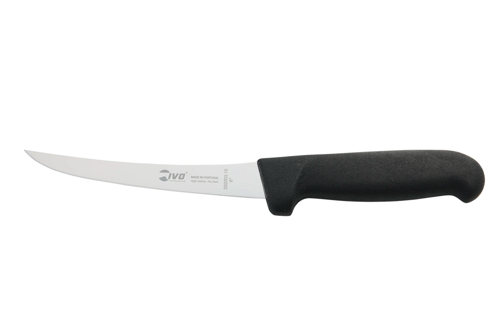 Introducing our IVO® 6" Butchercut Black Semi-Flex Curved Boning Knife, ideal for adventurous outdoorsmen and anglers who value precision and durability in their gear. This premier knife is crafted for those who venture into the wild to process game and fish. Engineered to excel in field dressing and filleting, our blades are meticulously crafted to deliver exceptional performance under demanding conditions. With precise tempering and superior steel hardness, our knives ensure reliable quality and precision with every cut. Elevate your outdoor culinary experience with Butchercut.