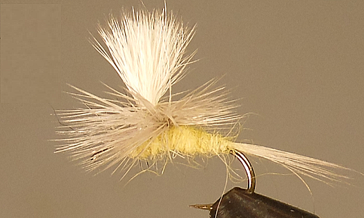 The Parachute Pale Morning Dun is typically tied with a grayish-olive body, clear wings, and a tail parachute post. The parachute post makes the fly float upright on the water, and the tail provides both balance and movement. The clear wings imitate the clear wings of a natural PMD.