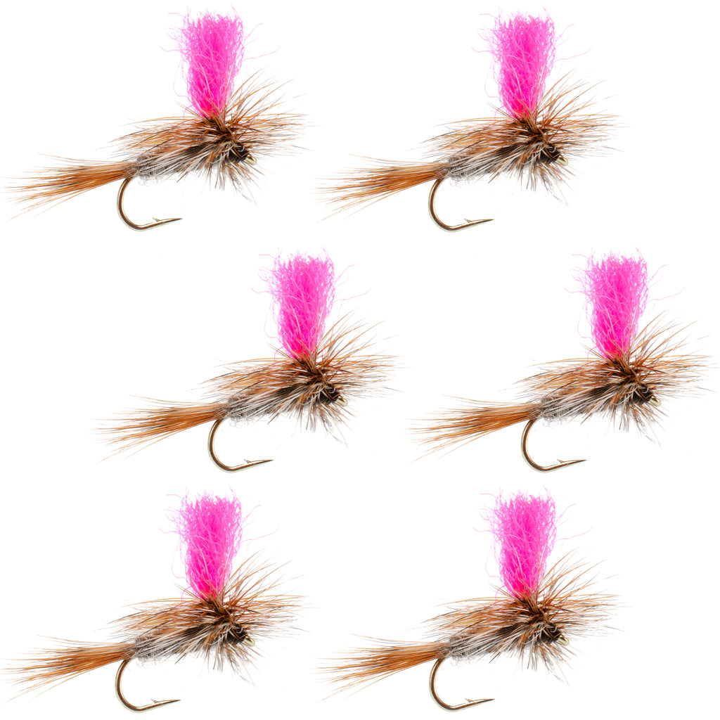 1 Set of 6 Dry Flies — Pack includes 6 hand-tied Adams hi-viz parachute dry flies; suitable for trout fishing in freestone rivers, tailwaters, and stillwaters