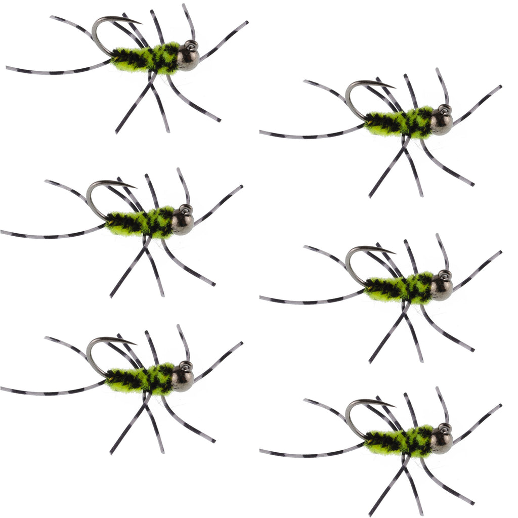 Barbless Pat's Barred Rubber Legs Tungsten Bead Jigged Black/Chartreuse Euro Nymph - Set of 6 Flies Hook Size 6