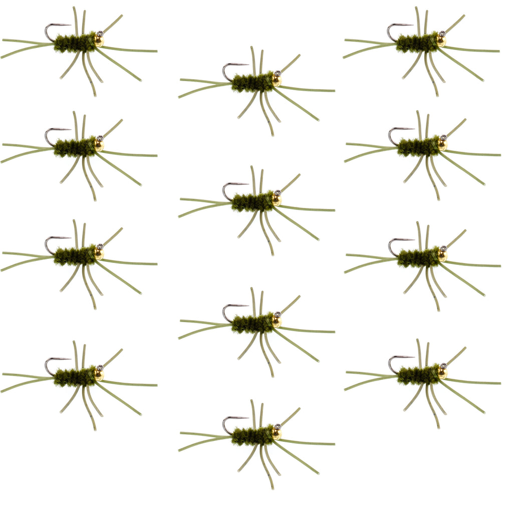 Barbless Pat's Rubber Legs Tungsten Bead Jigged Dark Olive Euro Nymph - Set of 12 Flies Hook Size 10
