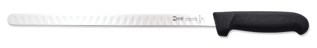A 12" slicing knife with grantons is typically used for slicing large cuts of meat, such as salmon, roasts, ham, turkey, or beef brisket. The grantons, or scalloped edges, create air pockets between the blade and the food being sliced, reducing friction and allowing for smoother, cleaner cuts. This type of knife is designed to produce thin, uniform slices with minimal effort, making it ideal for preparing meats for serving or further processing. The long, slender blade of the slicing knife allows for precise control and smooth, even cuts, resulting in beautifully presented slices of meat. Overall, it's an essential tool for any processor, kitchen, or culinary professional who frequently works with large cuts of meat.